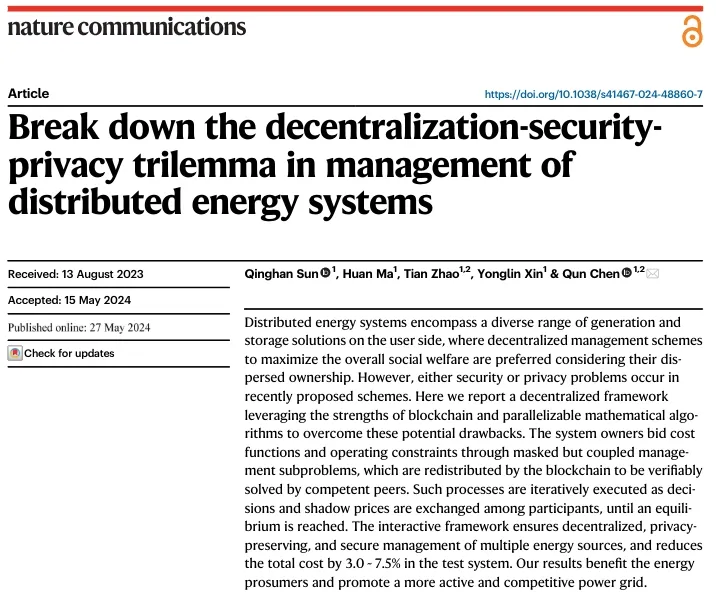 5月27日,陈群教授团队在《自然·通讯》(Nature Communications)发表题为“打破分布式能源系统管理中的去中心化-隐私-安全三重困境”(Break down the Decentralization-Security-Privacy Trilemma in Management of Distributed Energy Systems)的文章。