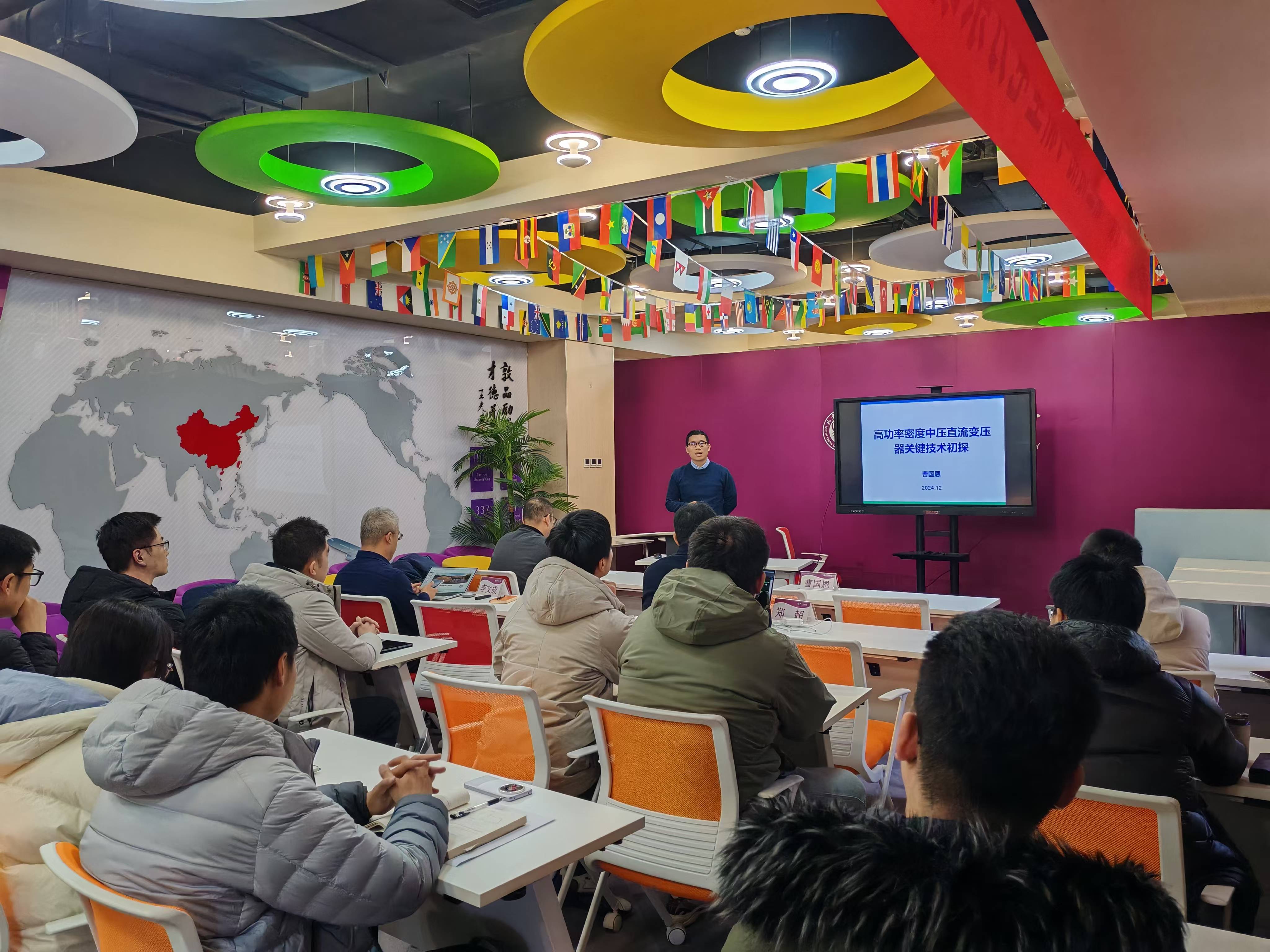 在主题报告环节,曹国恩以“高功率密度中压直流变压器关键技术初探”为题,介绍了电力电子变压器、能量路由器的应用领域,以中压直流变压器为切入点,分析了目前研究中存在的问题,针对高隔离耐压变压器,介绍了以PCB为主体、电场匀化为主要方法的高耐压平板变压器的设计方法,并通过实验测试进行了验证。曹国恩通过对关键问题的分析、解决方法的逻辑跟大家分享了做科研的经验,多了解学术前沿动态、多查阅文献资料、多关注交叉学科问题。