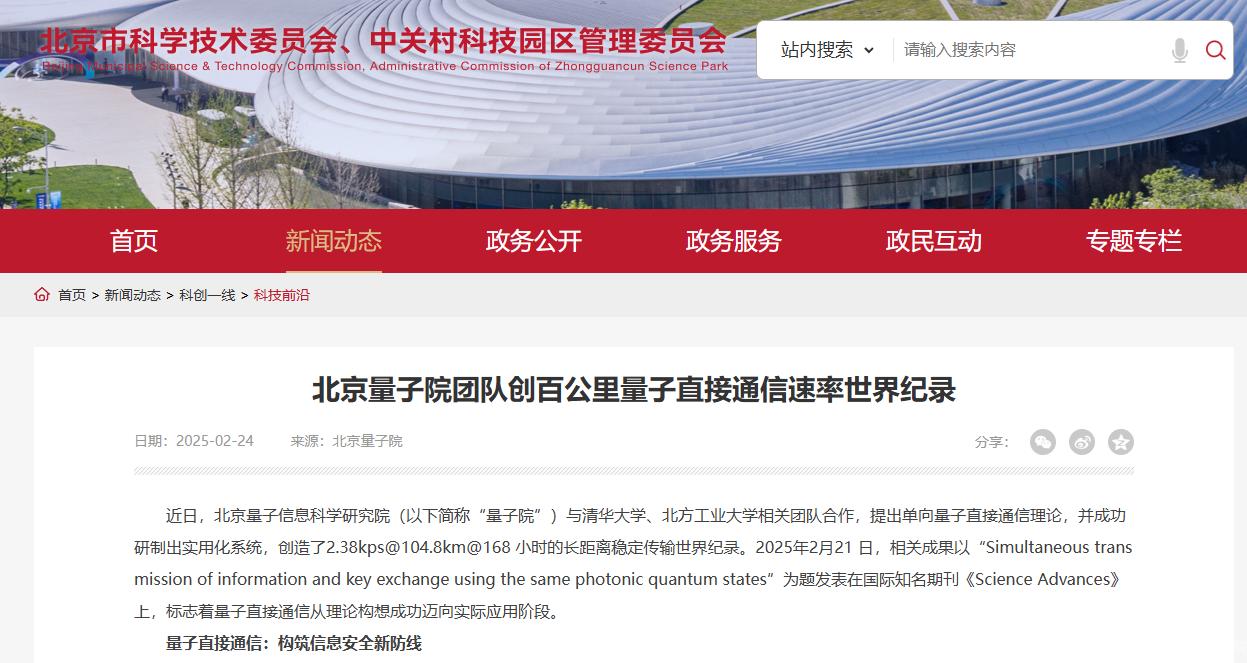 近日,储能量子直接通信与计算团队作为参研单位,与北京量子信息科学研究院和清华大学相关团队合作,提出单向量子直接通信理论,成功研制出实用化系统,创造了在104.8公里标准光纤通信实验测试中连续168小时、速率为2.38kbps的稳定传输世界纪录。相关成果于2025年2月21日在国际知名学术期刊《Science Advances》(《科学进展》)上发表,这标志着量子直接通信从理论构想成功迈向实际应用阶段。